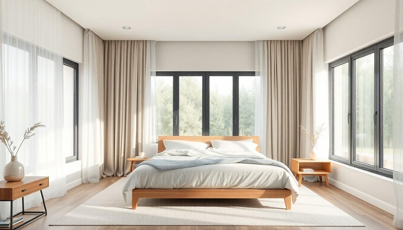Calm colors like beige, gray, and soft white create a soothing environment. These shades help reduce stress, making them ideal for retreat spaces. Natural elements enhance tranquility, bringing serenity indoors. Soft textures from cotton and linen further add to the calming effect. Large windows allow for ample natural light, which contributes to an airy, open vibe. Light-filtering sheer curtains maintain privacy while keeping the room bright. Altogether, these aspects foster a peaceful haven for rest and unwinding after a busy day.